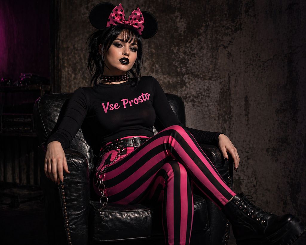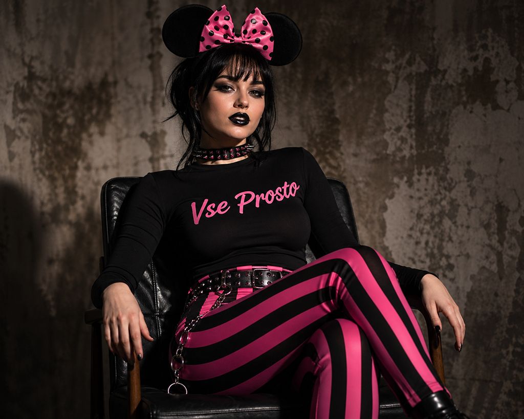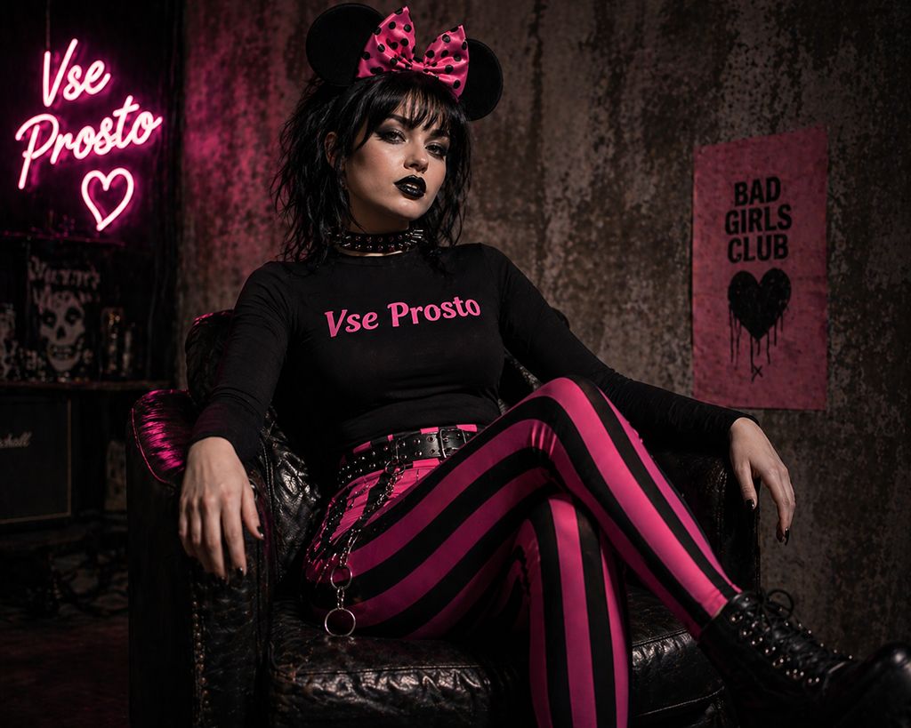 Medium shot portrait of a young Russian woman with black hair styled with a pink and black polka dot bow and large black mouse ears, seated in a three quarter pose with her left leg crossed over her right, body leaning back into a chair, fitted long sleeve black top fully covering the shoulders with pink text saying “Vse Prosto”, high waisted fitted pants with bold black and hot pink stripe pattern, studded choker, chain belt with metallic ring details, curvy elegant silhouette, intense expression, smoky dark eyeshadow, dramatic eyeliner, glossy black lipstick, looking directly at the camera, indoor dimly lit setting with textured muted background, dramatic shadows highlighting facial features and clothing sheen, edgy fashion aesthetic, cinematic lighting, realistic textures, medium shot composition, high detail