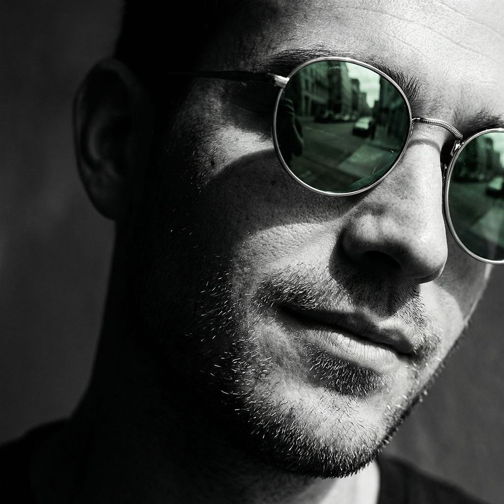 Светотеневой рисунок формирует почти графичную структуру кадра. Чёрно-белая основа подчёркивает форму лица и текстуру кожи, а единственный зелёный оттенок в отражении линз работает как эмоциональный якорь. Фон полностью растворяется в темноте и мягком размытии, исключая любые отвлекающие элементы и усиливая концентрацию на лице.