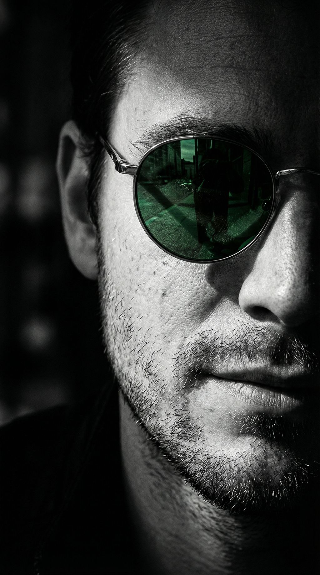 Photorealistic ultra-close angled portrait of a man, captured so tightly that only part of his face is visible. One side of the face is immersed in deep cinematic shadow, while the other is sharply illuminated, emphasizing a strong jawline, natural skin texture, visible pores and light beard stubble. High-contrast black-and-white grading dominates the image, with selective color preserved only in the green mirrored reflection of retro round sunglasses. The composition is extremely tight, focusing on the eyes behind the lenses and a subtle confident smirk on the lips. Moody chiaroscuro lighting, dark softly blurred background, shallow depth of field similar to a portrait lens, intense rebellious atmosphere, refined cinematic realism.
