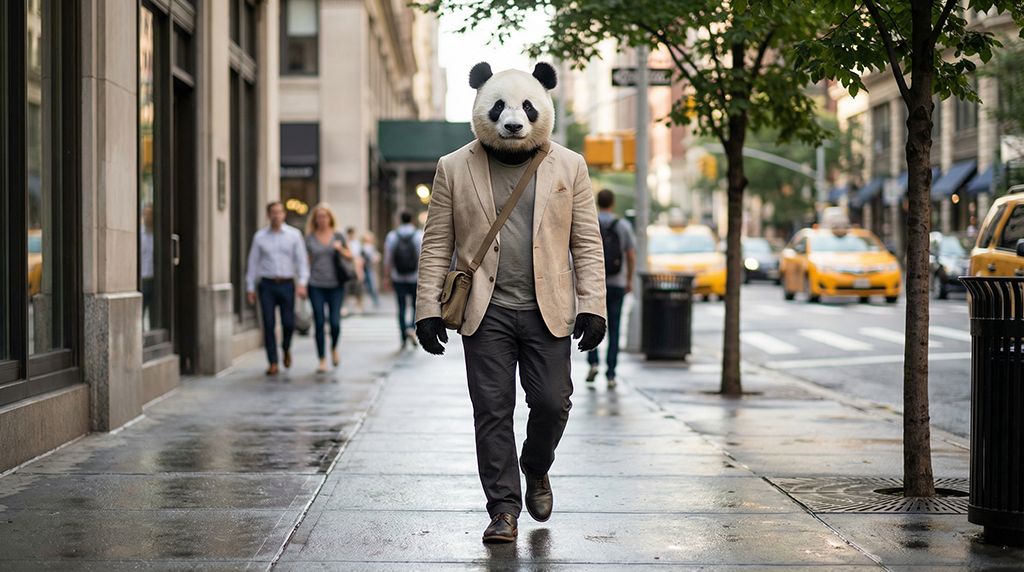 Сцена выстроена как неожиданная городская зарисовка, где антропоморфная панда становится главным визуальным акцентом дневной улицы. Образ сочетает реалистичное освещение и документальную подачу с лёгким сюрреализмом, возникающим за счёт присутствия животного персонажа в человеческом контексте. Композиция сохраняет спокойный, почти повседневный ритм, что усиливает эффект необычности происходящего.
