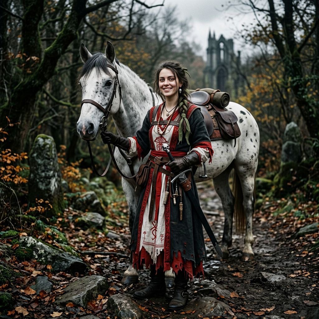 Dark fantasy portrait of a young woman styled as a death priestess, pale skin, gray eyes, long hair tied into a messy braid with a green ribbon, wearing simple earrings with pendants, dressed in a robe with white and scarlet fabric elements, sword at her belt, cheerful and slightly mischievous expression, standing beside a white horse with gray spots, moody lighting, cinematic atmosphere, detailed textures, fantasy style, high realism