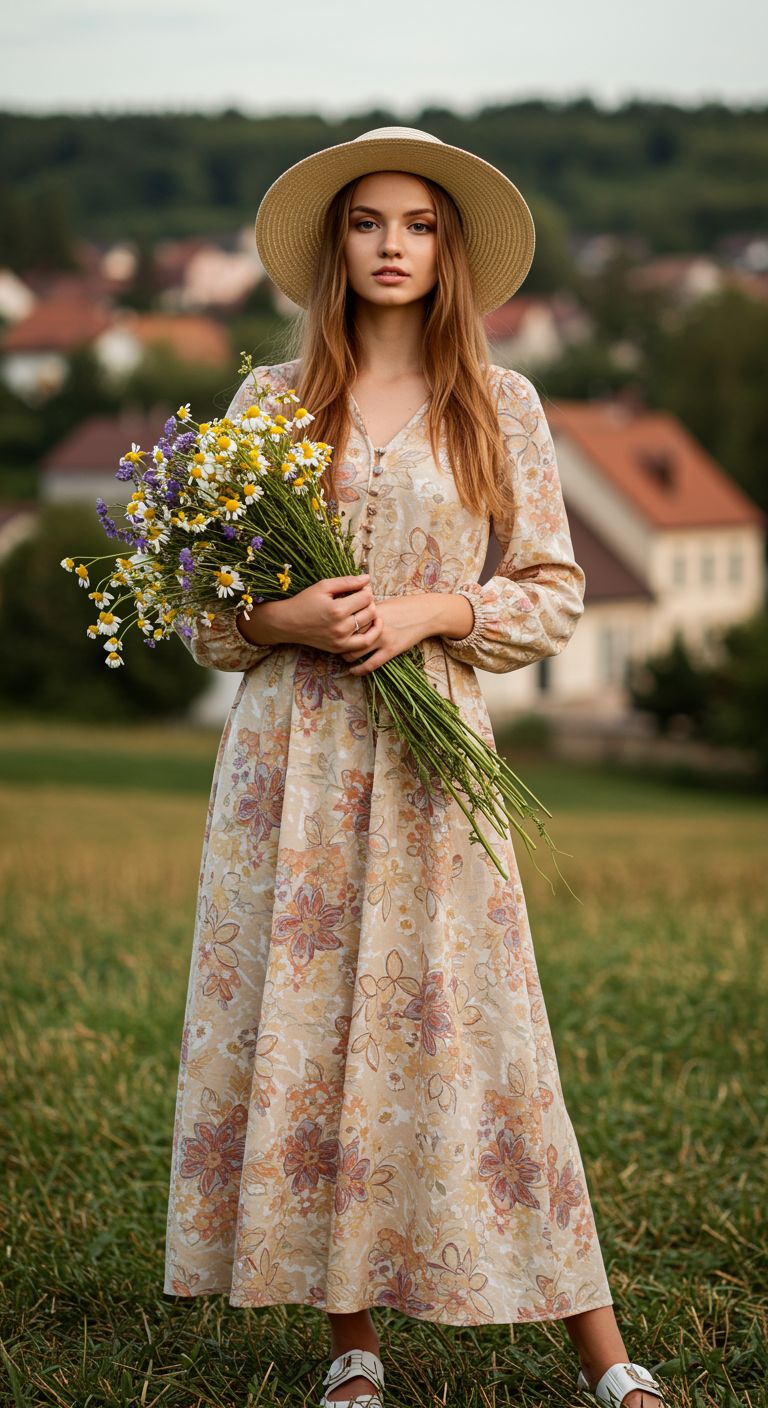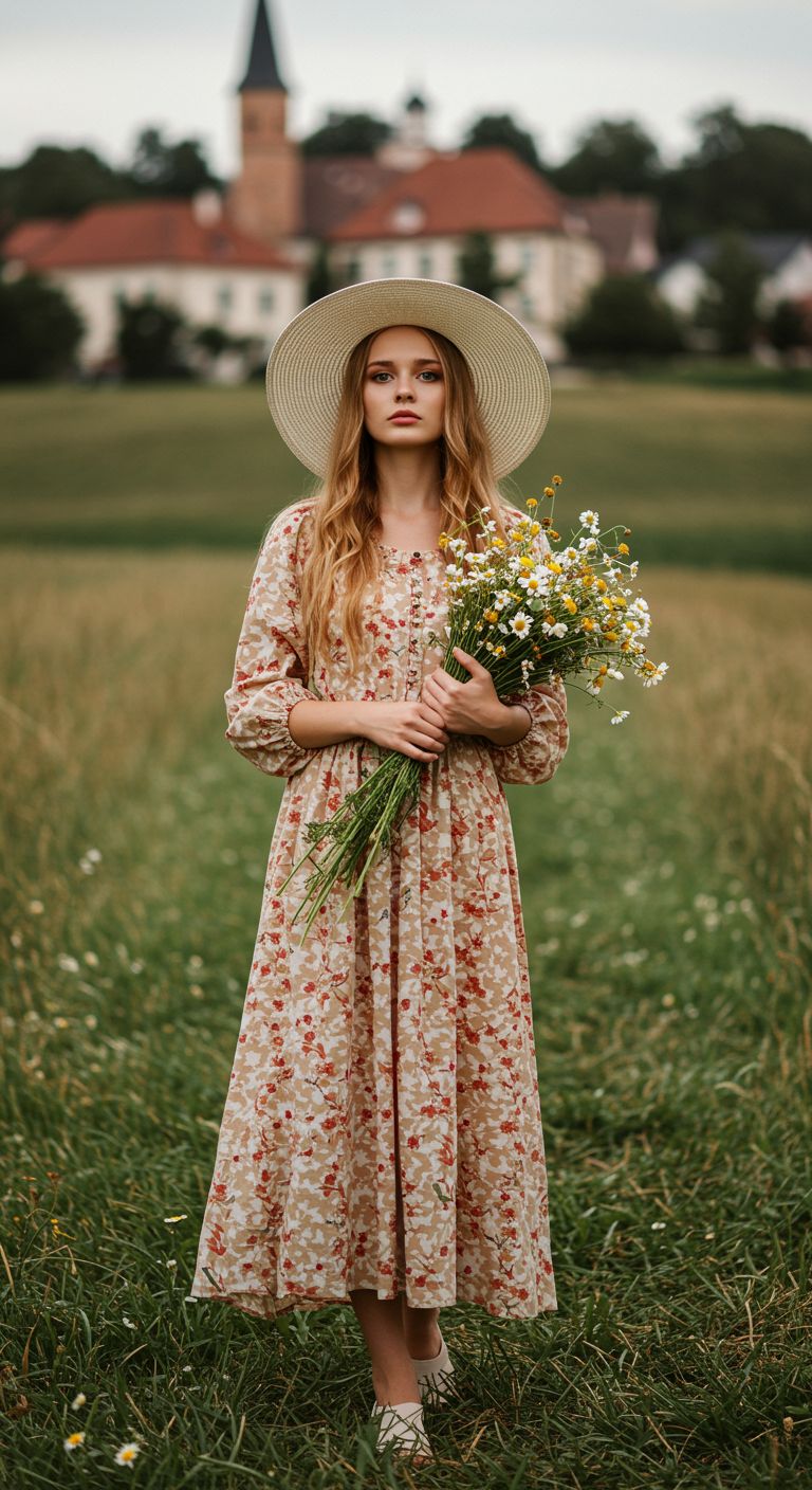 Elegant full-length fashion portrait of a graceful woman in a flowing long-sleeved dress and a wide-brimmed white hat, holding a bouquet of wildflowers, highly detailed face, ultra high resolution, editorial fashion style, softly blurred background revealing a small 19th century town, refined composition, natural soft lighting