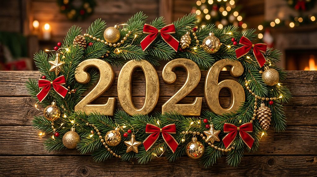 Photorealistic image of the numbers «2026» in bold typography wrapped in pine garland with red ribbons and golden ornaments, placed on a rustic wooden background, soft glowing string lights around, warm cozy christmas atmosphere, detailed textures, soft lighting