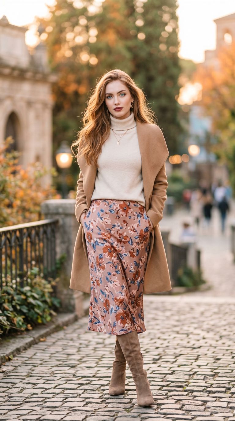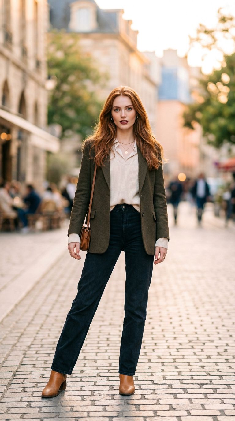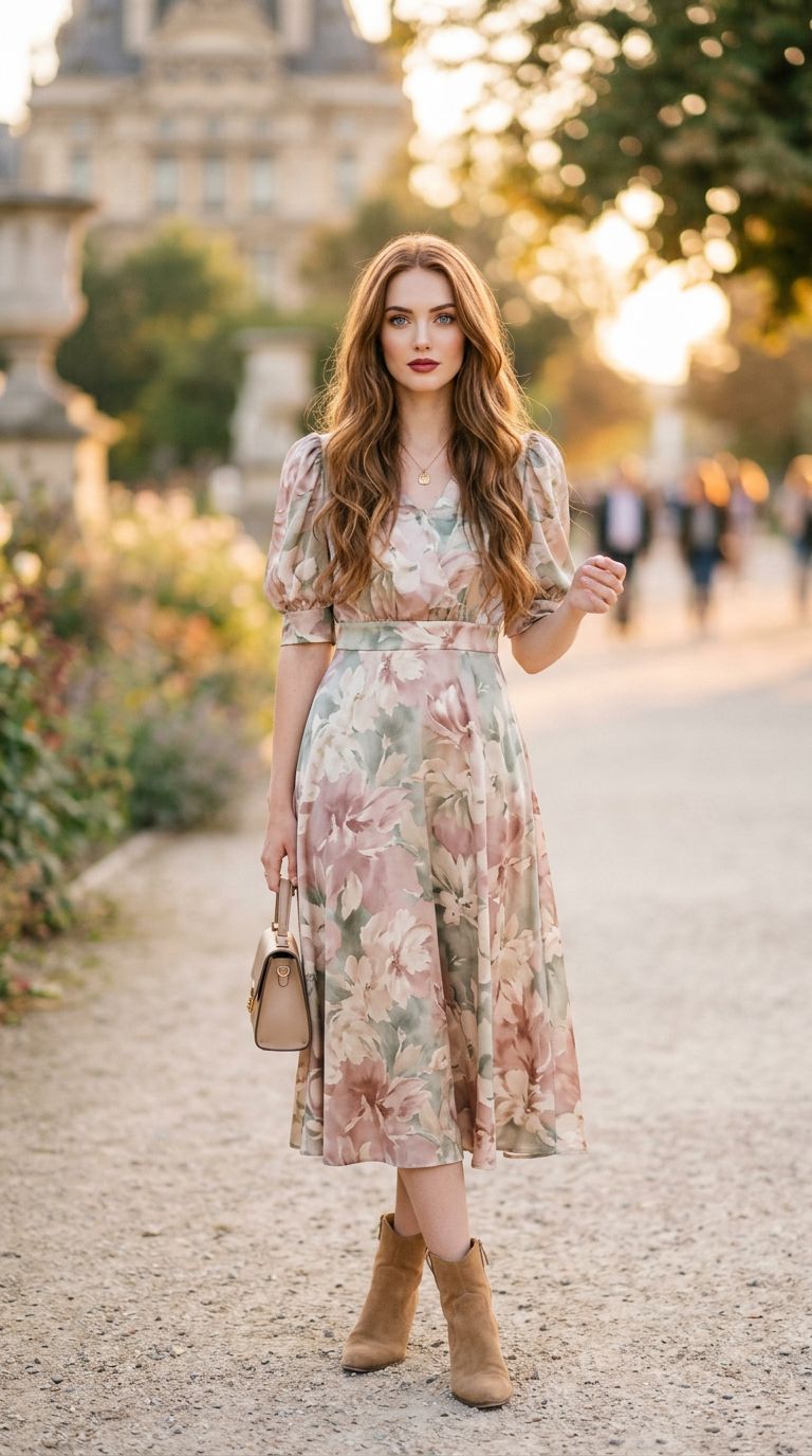 Vertical full-body portrait of a stylish young supermodel in her early twenties with fair skin and long auburn hair, warm golden hour lighting, dramatic yet soft pastel color tones, blurred background, sharp focus on expressive vibrant blue eyes, smooth detailed skin, well-defined nose and cheekbones, full burgundy lips, soft contrast and balanced saturation