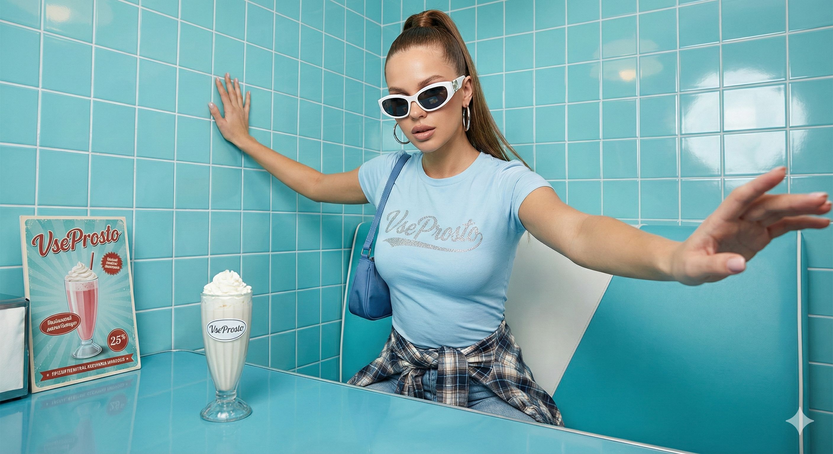 Stylish commercial fashion portrait inside a vibrant retro aqua-blue tiled room. A young woman poses confidently, wearing oversized white sunglasses, hoop earrings, a sleek ponytail, and a fitted light-blue T-shirt with bold glittery “VseProsto” lettering. One hand presses against the tiled wall while the other extends outward, creating a dynamic pose. A flannel shirt is tied at her waist, and a small blue shoulder bag completes the look. On a glossy blue table in front of her stands a tall creamy milkshake labeled “VseProsto” alongside a matching retro poster. Ultra-wide perspective, soft cinematic lighting, polished surfaces, bold teal color palette, hyper-realistic commercial advertising style, ultra-high detail.