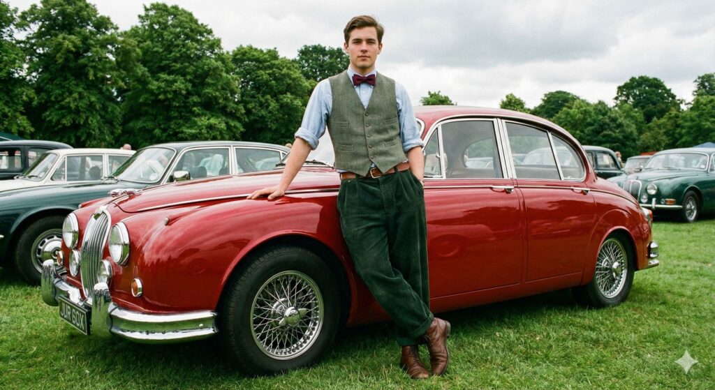 Ultra-realistic 1990s vintage documentary-style portrait, preserving the subject’s real face and facial features without any modification. A young man leans casually against a classic red Jaguar Mark 2 with chrome wire wheels and polished bumpers. He wears a burgundy bow tie, a grey-green checked waistcoat over a light blue dress shirt with rolled sleeves, dark green loose corduroy trousers, brown leather boots, and a classic belt. Relaxed posture: one arm resting on the car hood, the other hand in a pocket, ankles crossed. Background shows several vintage classic cars and lush green trees at an outdoor car event. Overcast sky, soft cinematic lighting, authentic colors and textures, high detail on clothing, car and environment, no other people in frame.
