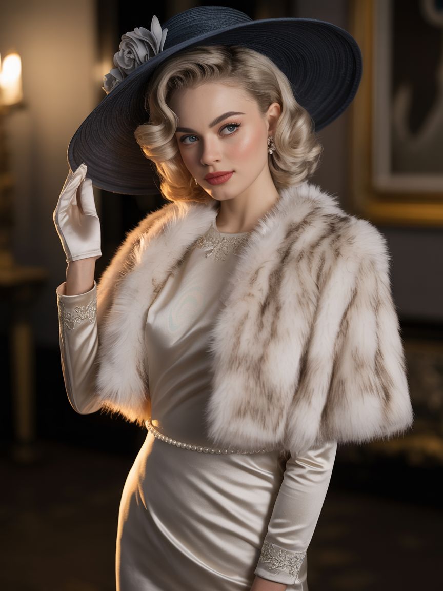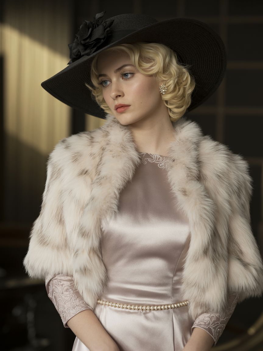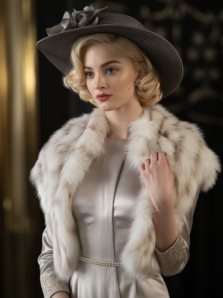 Contemporary female figure, 22 years old, elegant and sophisticated. A glamorous young Russian woman with vintage Hollywood charm, platinum blonde hair styled in soft curls, expressive blue eyes, and refined makeup with a classic red lip. She wears a luxurious cream-colored faux fur stole over an elegant fitted satin dress in pearl-gray with a high neckline and subtle embroidery at the cuffs and collar. The dress accentuates her graceful silhouette while remaining modest and refined. She also wears a thin pearl belt and delicate earrings that glimmer softly in the warm light. Her wide-brimmed black hat with fabric flowers is tilted slightly, adding drama to her pose. The background is dark and cinematic, with gentle golden highlights and moody shadows that evoke the quiet elegance of a bygone era.