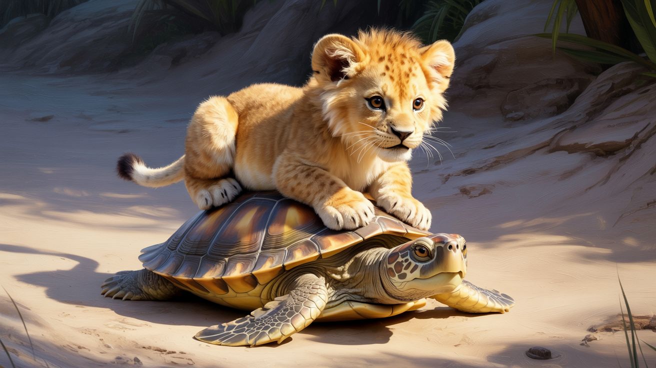 Львёнок и черепаха: тёплая фантазийная сцена, созданная нейросетью Ideogram