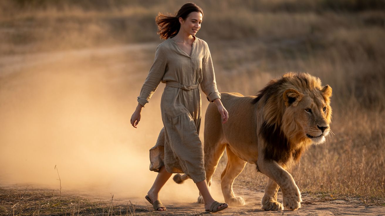 A dynamic cinematic photograph of a young woman walking beside a majestic lion at sunset. She wears a modest ankle-length linen dress with long sleeves and a simple fabric belt. Her outfit flows naturally in the breeze without excess exposure. She walks barefoot in light brown leather sandals through dry grass, the warm sunset light illuminating her profile and the lion’s mane. Dust swirls around them, glowing softly in the air. Both figures move in harmony — calm, strong, and regal. The lighting is golden and cinematic, emphasizing natural textures of fabric, skin, and fur. Captured with an 85mm lens, f/1.8, ISO 200, 1/500s shutter speed, shallow depth of field, soft background blur, and a high level of photorealism.
