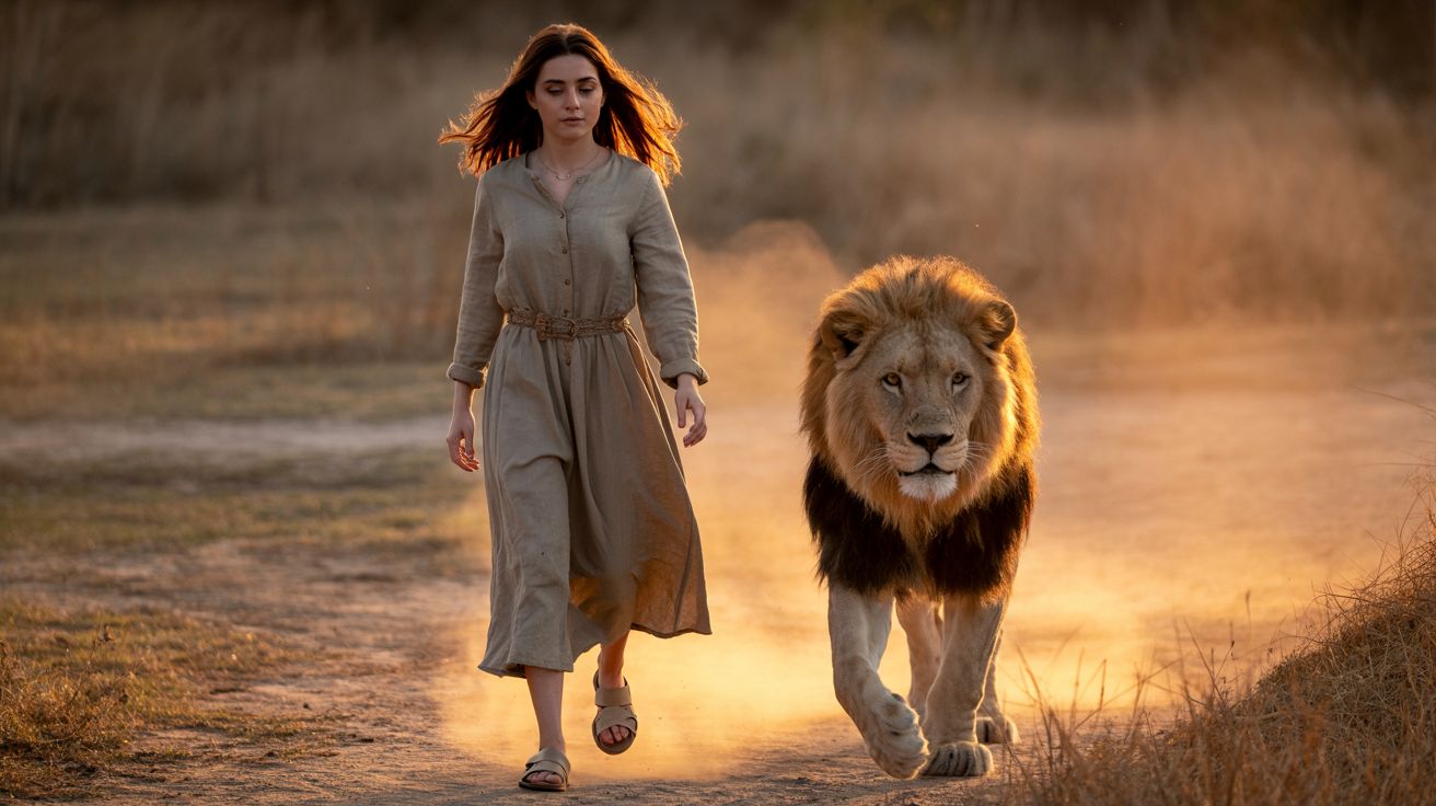 Эта сцена — не просто встреча человека и зверя, а поэма о равновесии и уважении к жизни. Девушка в скромной одежде и лев, идущий рядом, символизируют силу, мягкость и доверие.