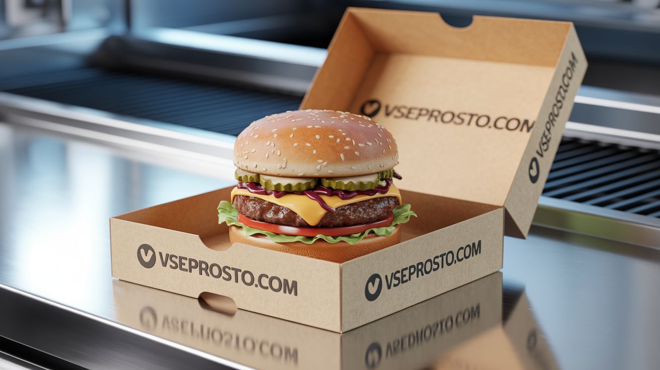 Созданное с помощью Ideogram.ai, это изображение передаёт эстетику современного фастфуда с акцентом на премиальность и аппетитную реалистичность. На чистой белой стойке лежит открытая фирменная коробка с надписью “vseprosto.com” на внутренней крышке и боковой грани. Внутри — идеально собранный бургер, сияющий свежестью и вкусом.