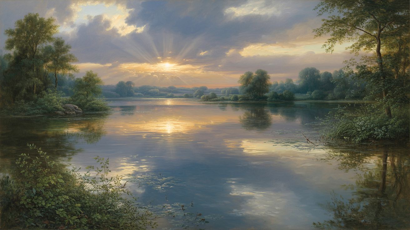 A highly detailed oil painting of a tranquil lake at sunset. The golden sun casts warm reflections across the calm blue water, surrounded by lush green foliage and distant silhouettes of trees. Rays of light fan gently through the clouds, creating a serene and atmospheric composition. The scene feels timeless, natural, and peaceful — a painterly harmony of color and light.