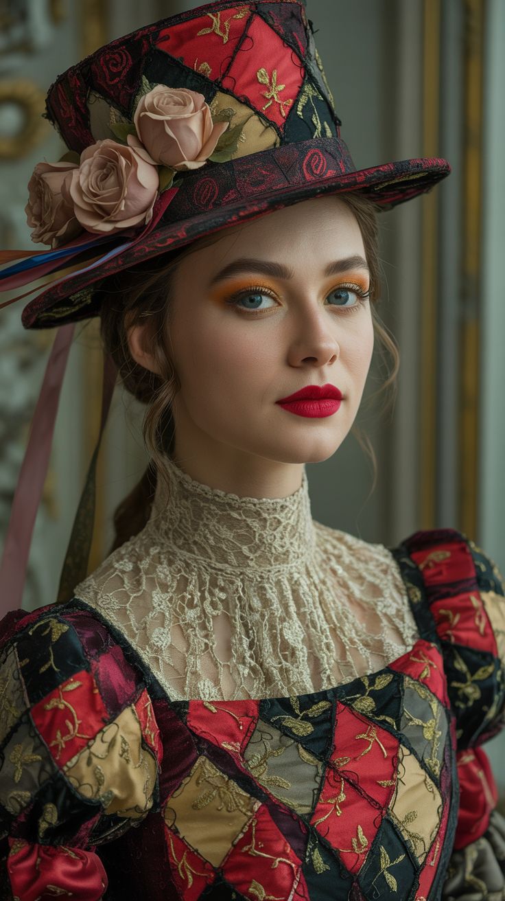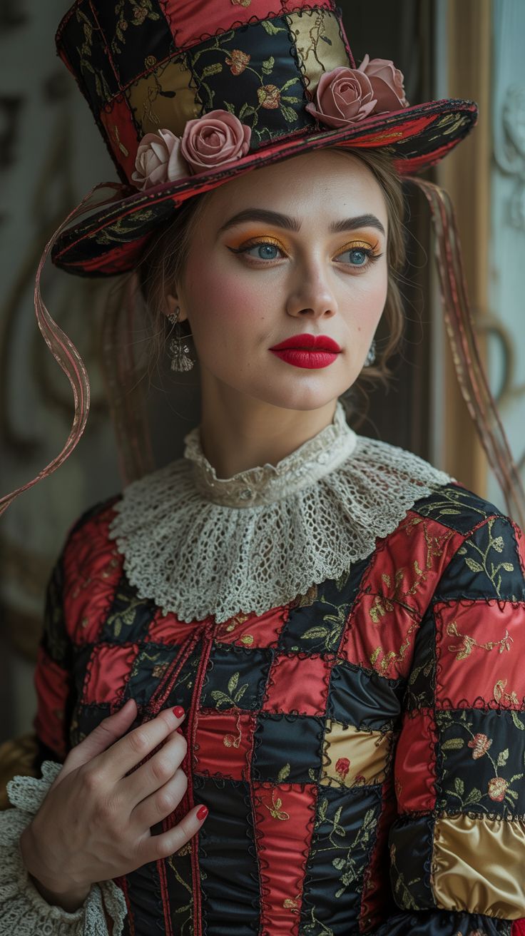 Realistic portrait of a young Russian woman wearing a regal, modest patchwork harlequin costume in red, black, and gold. The outfit features a high embroidered lace neckline and ornate fabric fully covering the chest and shoulders. She wears a tall top hat decorated with roses and flowing ribbons. Her makeup includes bold red lipstick, golden eyeshadow, and a graceful yet dramatic gaze. Soft cinematic lighting, vintage aristocratic masquerade portrait style, rich detailed textures, realistic skin tone, elegant expression.