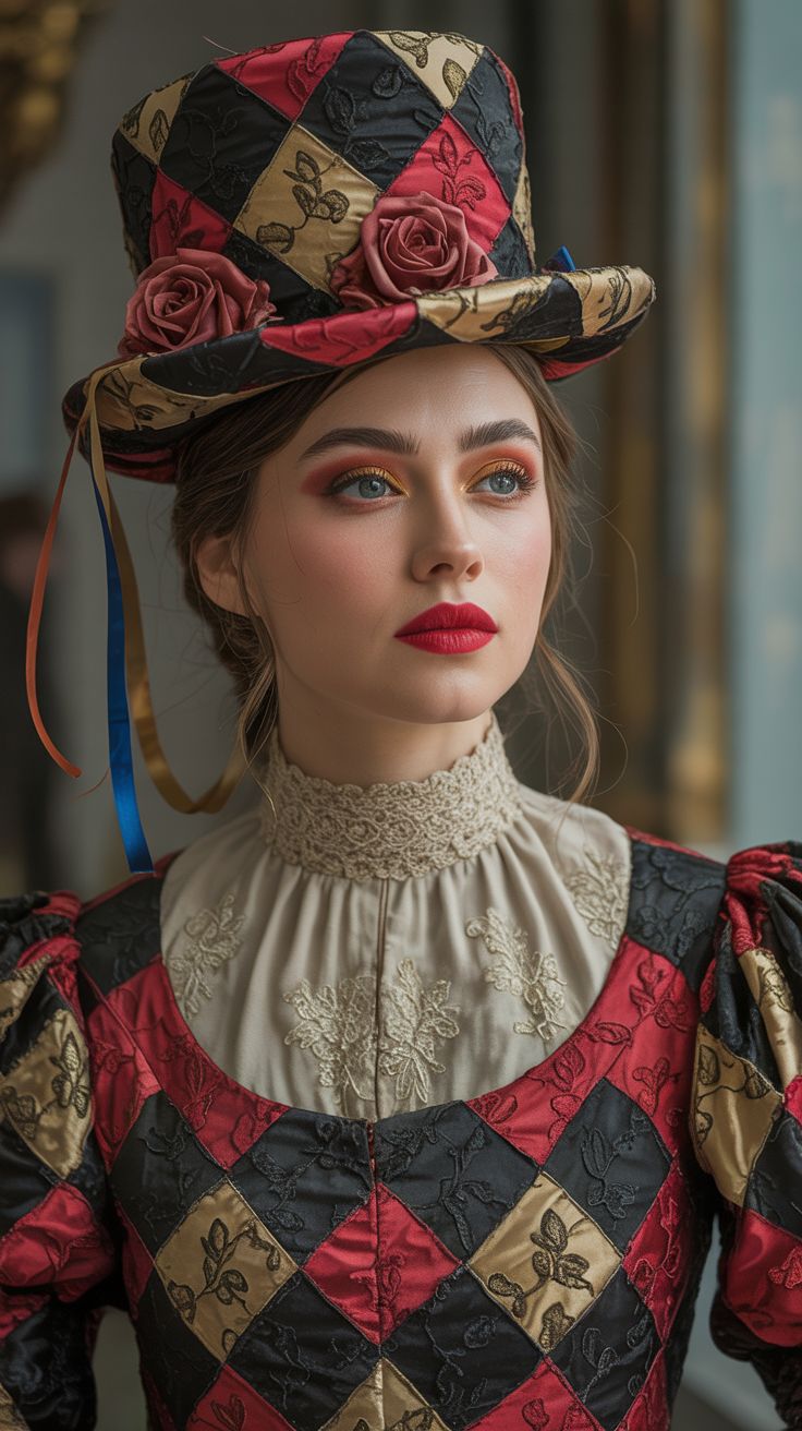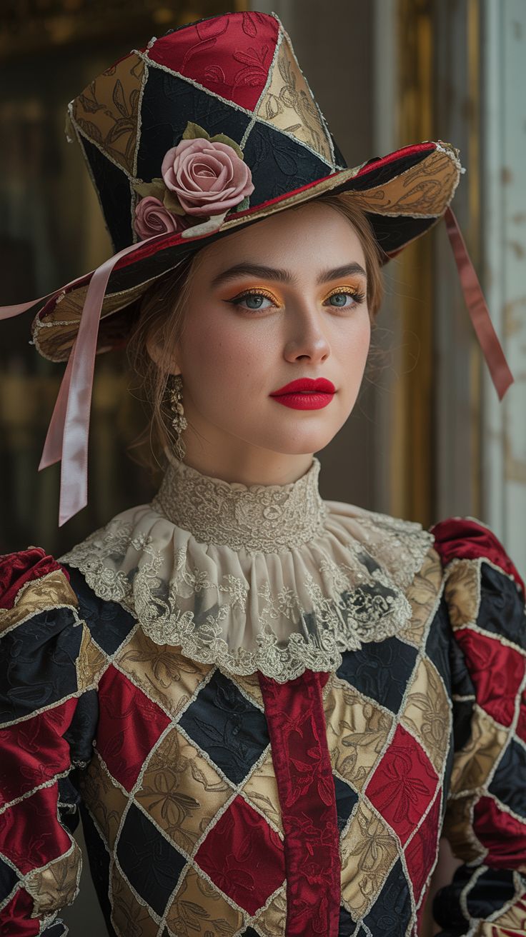 Молодая русская девушка в роскошном костюме арлекина стала воплощением аристократизма, женственности и художественной сдержанности, где каждый штрих подчёркивает грацию и достоинство.