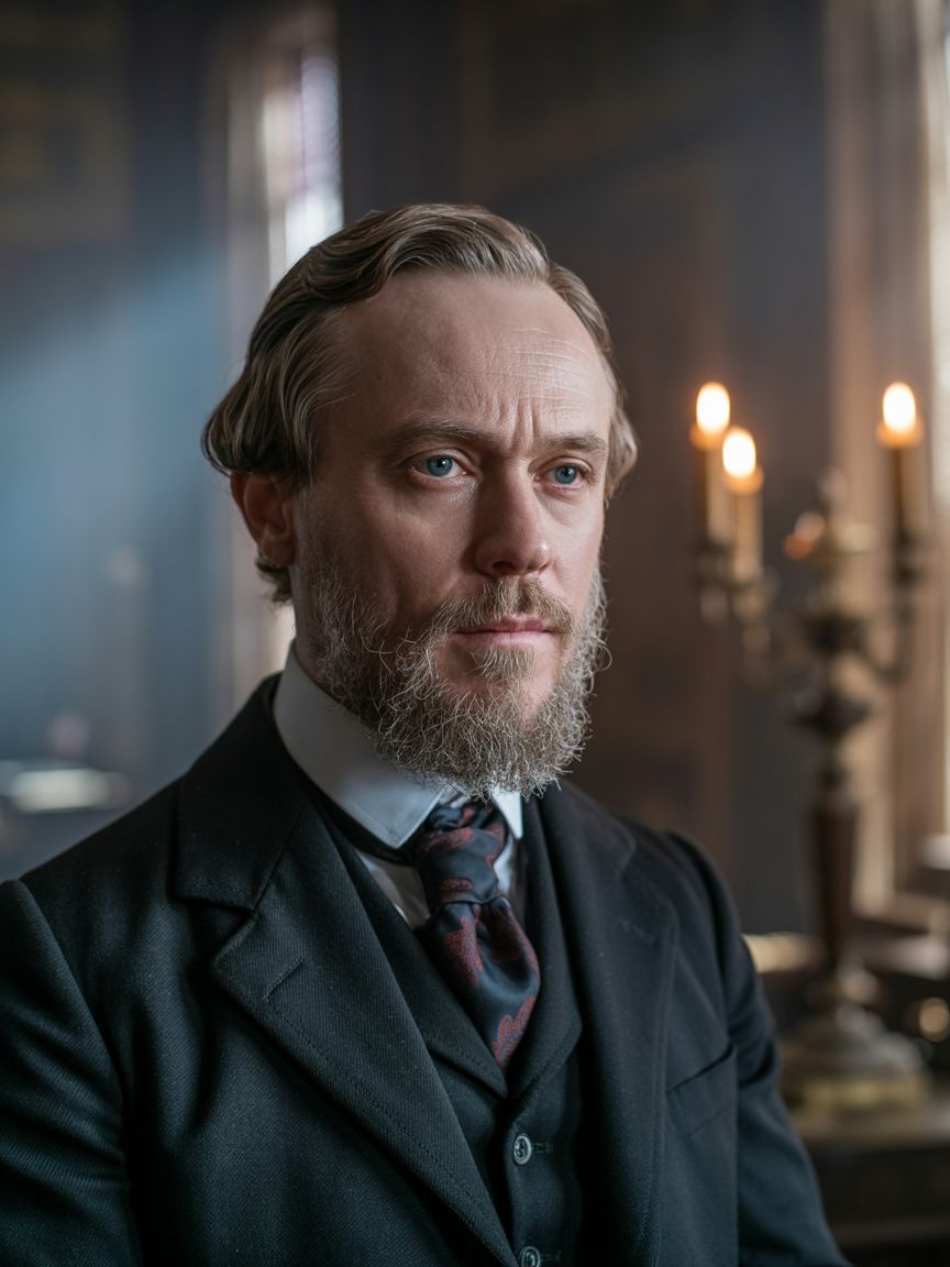 A Victorian-era scholar in a cinematic close-up portrait; photorealistic and highly detailed; professional commercial photography captured with a DSLR; precise facial geometry; dramatic rim lighting; subtle color grading; ultra-realistic composition with fine textures and atmospheric depth.