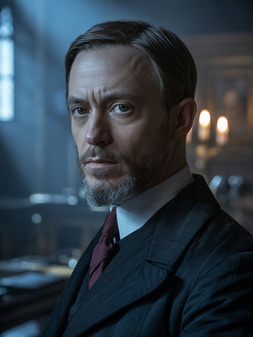 Герой изображён как собранный, интеллигентный и слегка задумчивый представитель викторианской эпохи. Его взгляд направлен в сторону или прямо в камеру, что усиливает ощущение личной истории, глубины и сосредоточенности.