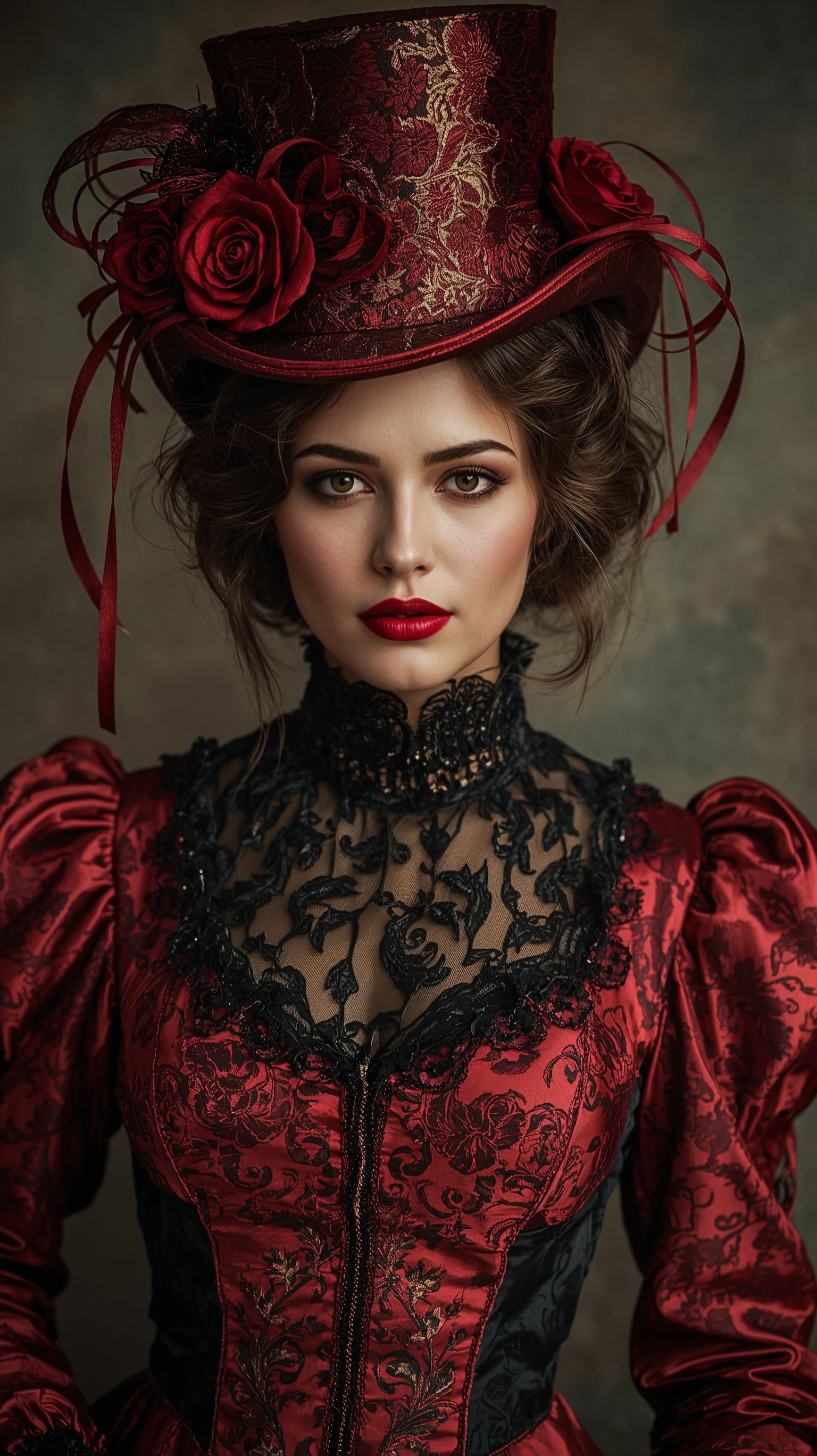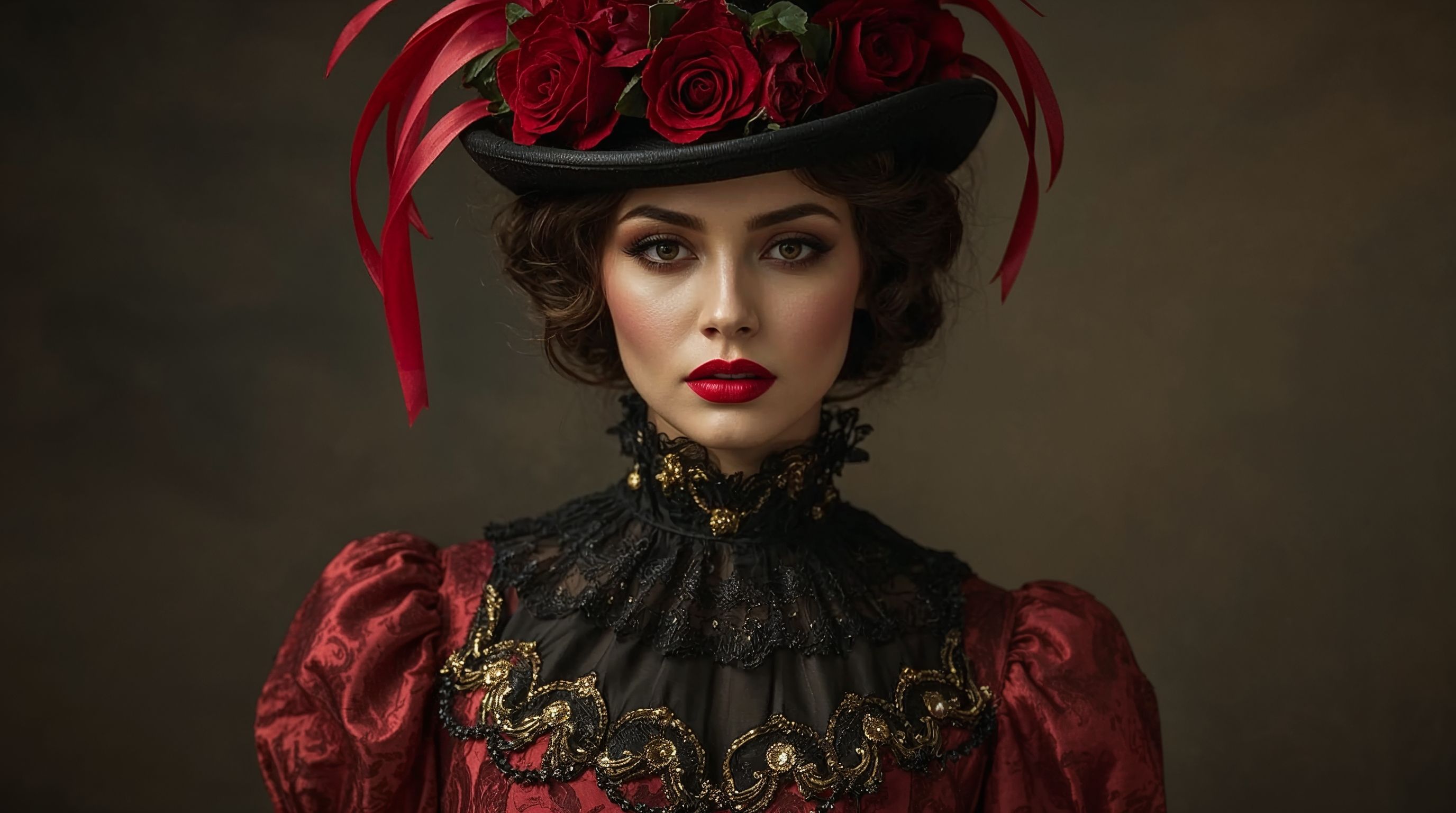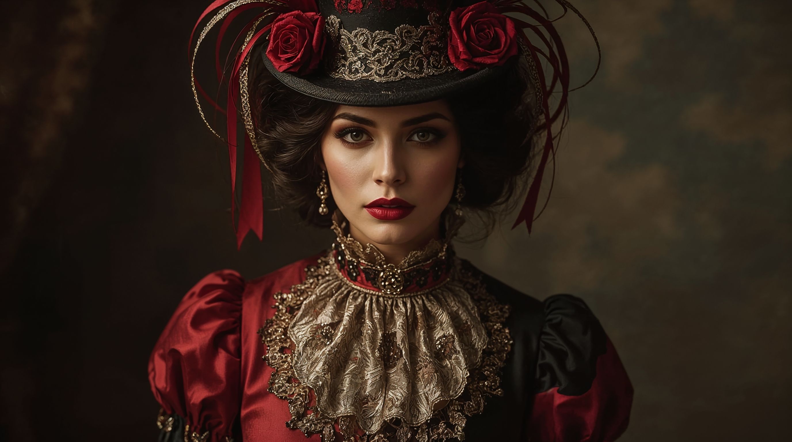 - детали: «roses and ribbons on hat, ornate textures, graceful gaze».
