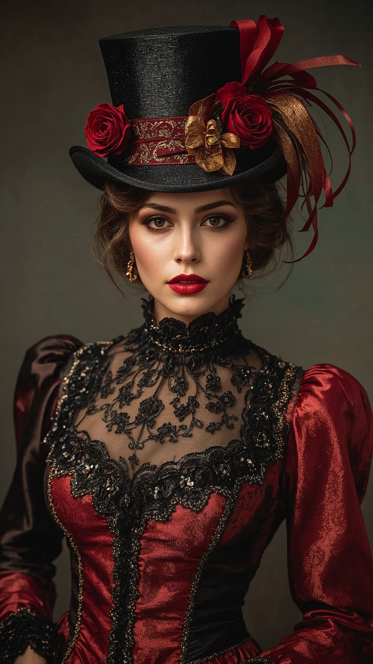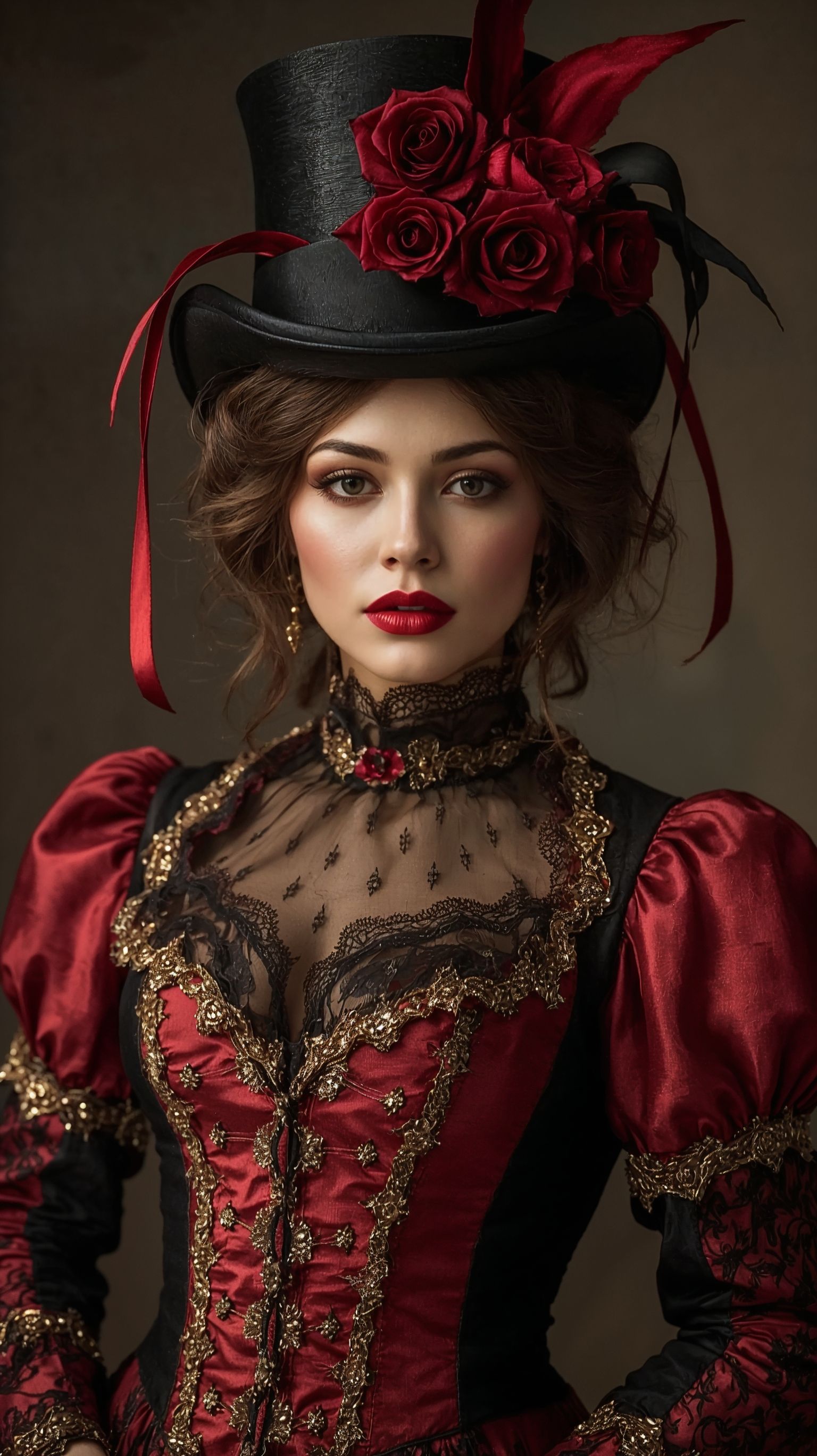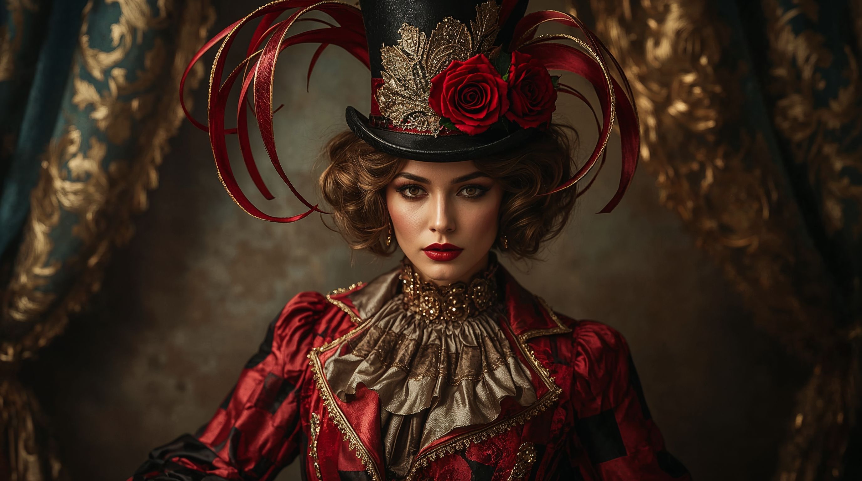 A regal carnival lady in a modest, fully covered patchwork harlequin suit of red, black, and gold. The outfit features a high neckline with embroidered lace and ornate fabric covering the chest area completely, leaving no visible skin. She wears a tall top hat decorated with roses and flowing ribbons. Her makeup includes bold red lipstick and golden eyeshadow, with a dramatic yet graceful gaze. The overall look radiates vintage elegance, soft cinematic lighting, aristocratic masquerade portrait style, and rich textures.