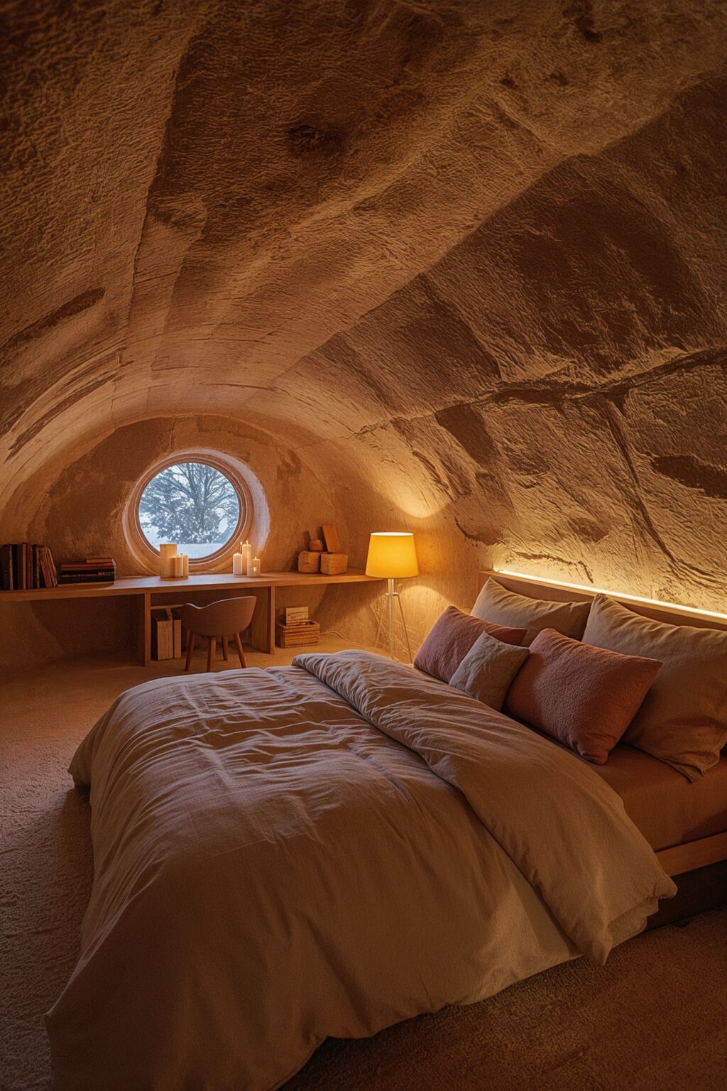 Это изображение, созданное с помощью нейросети Leonardo.AI, передаёт невероятное чувство уюта и тепла, спрятанного посреди холодного снежного мира. Мы видим спальню, встроенную в склон, словно часть самой природы. Плавные, округлые стены с глиняной фактурой мягко подсвечены тёплым светом, создавая ощущение защищённости и покоя. В центре — большая кровать с бежево-розовым постельным бельём, множеством подушек и мягких игрушек. За небольшим изогнутым окном тихо падает снег, искрящийся в лунном свете.
