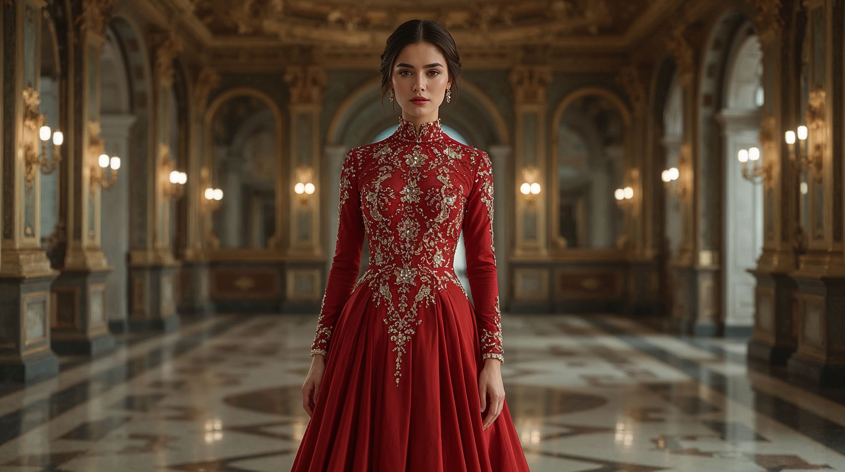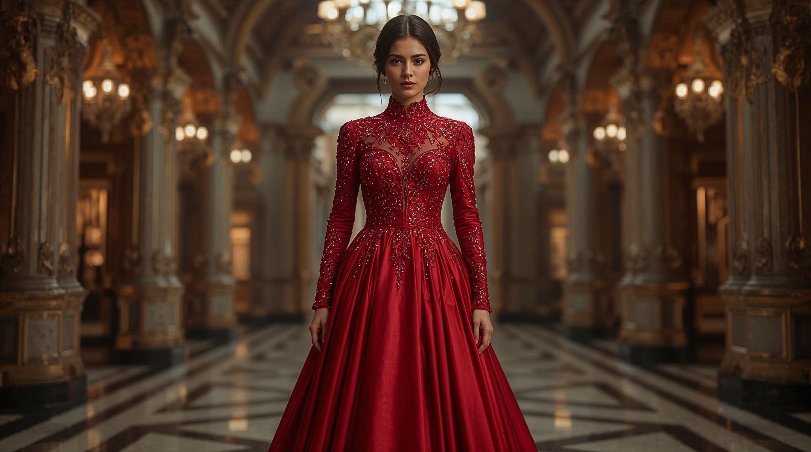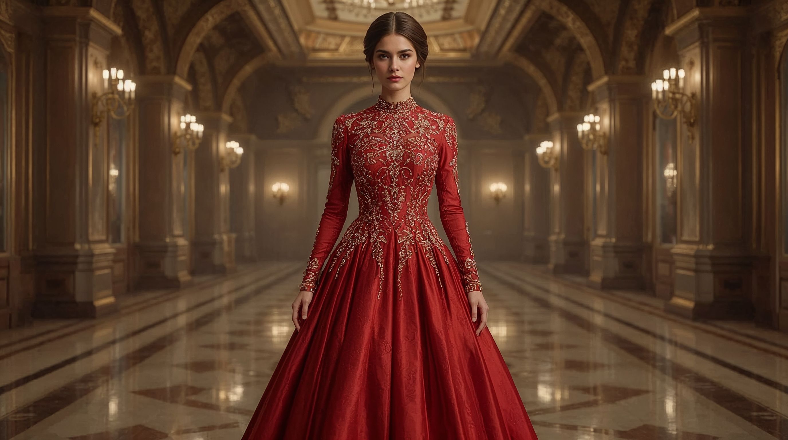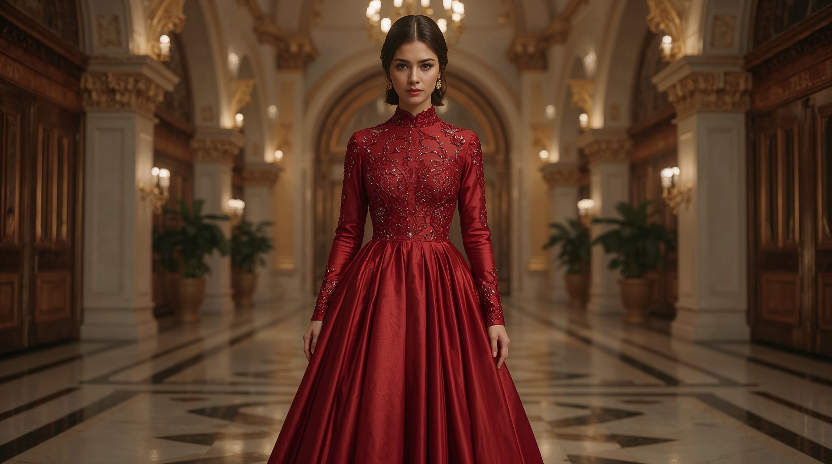 A gorgeous woman wearing a full-length, elegant red gown made of rubies and sparkling diamonds with intricate embroidery and fine brocade textures. The dress has a high neckline and long sleeves, fully covering the chest area with luxurious silk fabric. The design is refined, modest, and dignified, blending classic beauty with modern couture. The woman stands gracefully in a grand Sci-Fi Victorian-style hall with ornate architecture, golden accents, and cinematic soft lighting. Her hair is styled in an elegant updo, and her face radiates calm confidence and natural beauty. The atmosphere is regal, symmetrical, and ultra-realistic, rendered in octane quality with exquisite attention to detail.