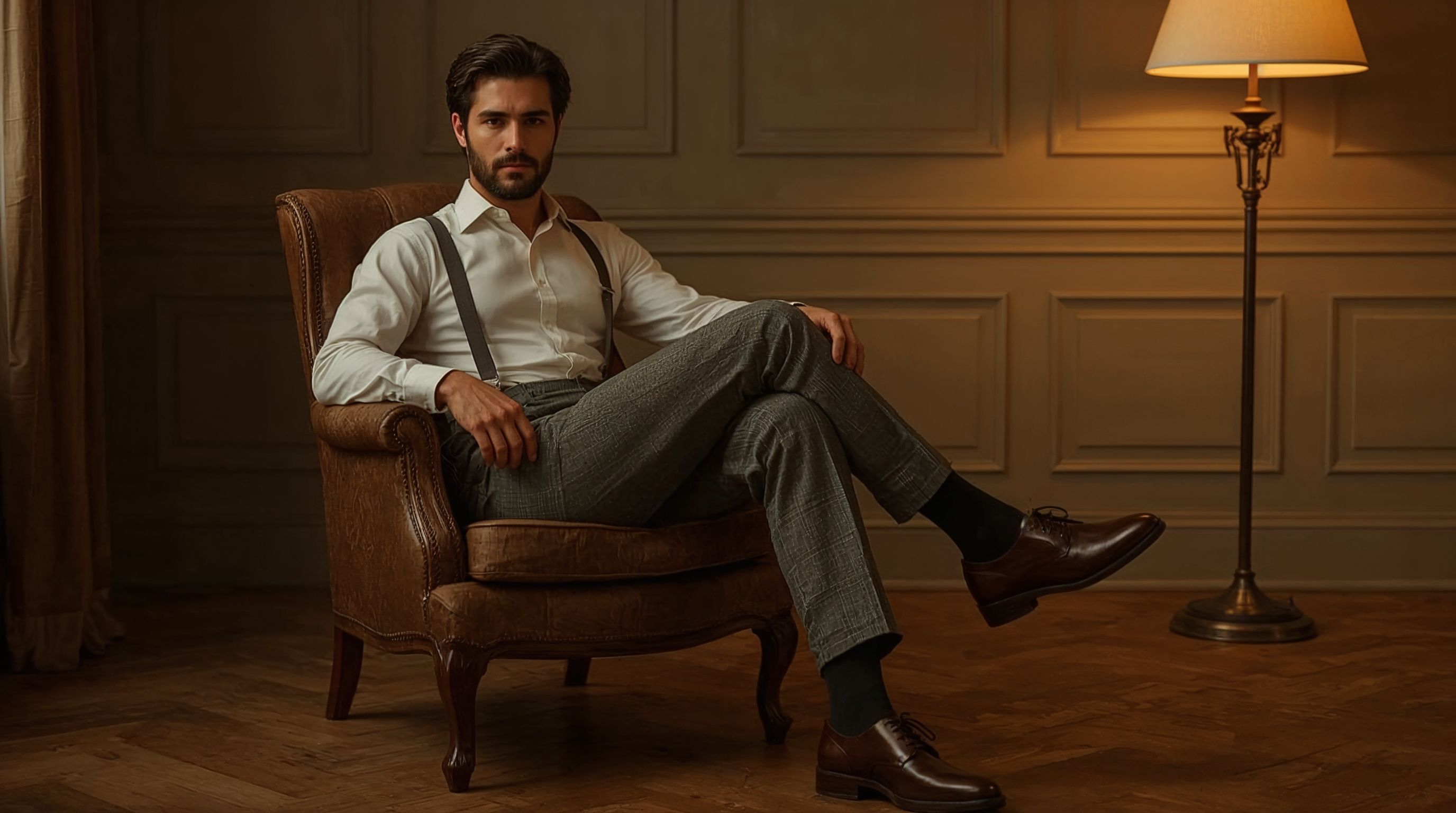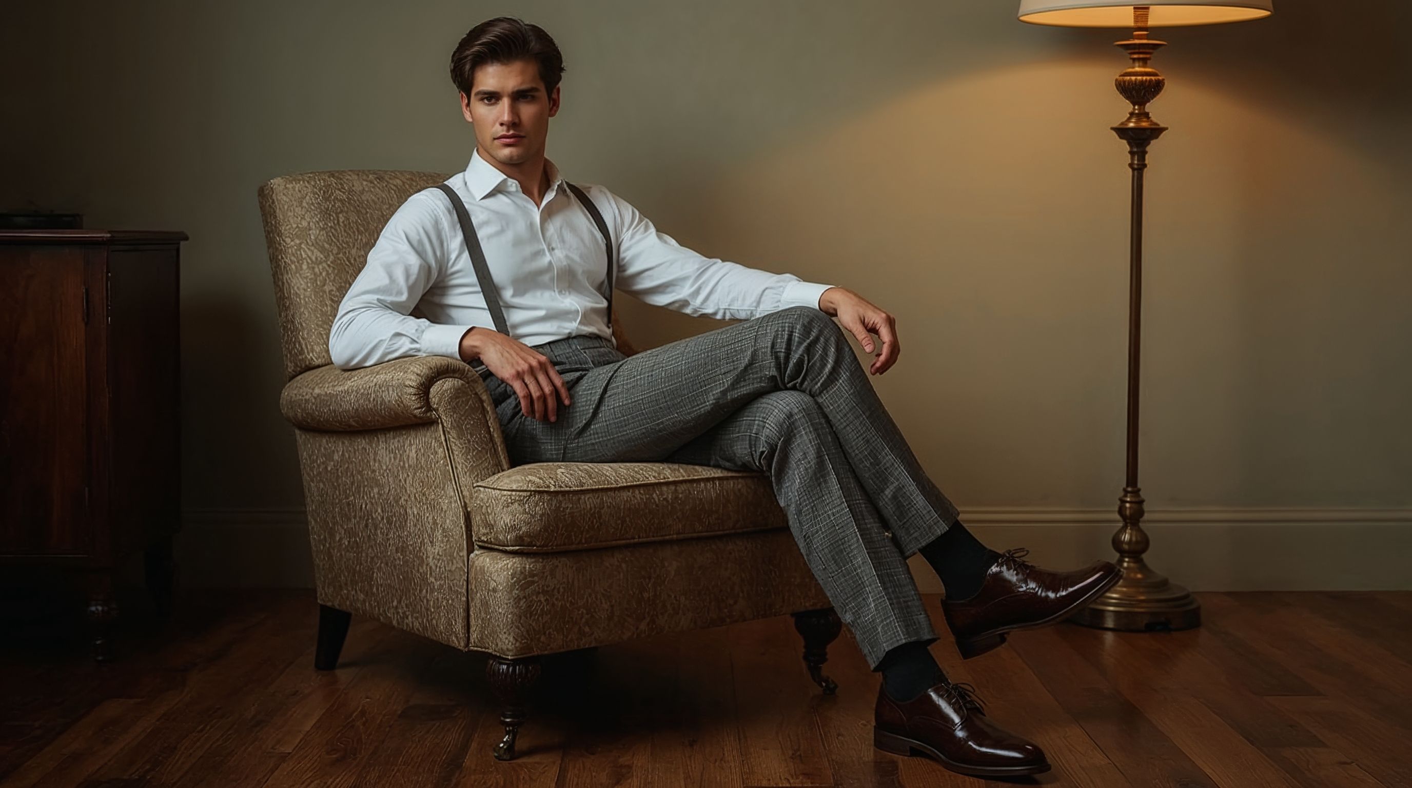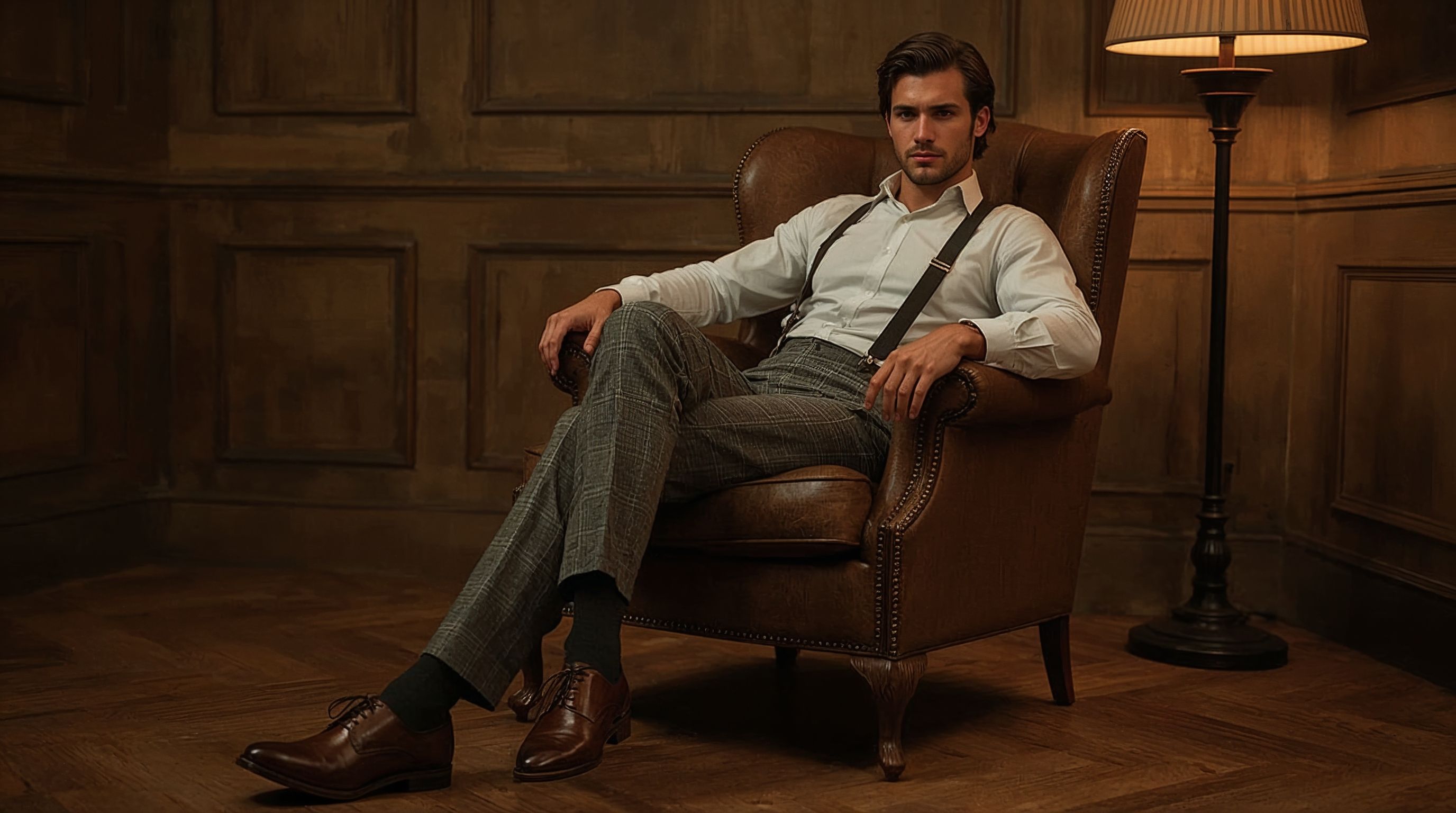 A hyper-realistic photo of a stylish Russian man sitting confidently in a vintage armchair. He is wearing a classic white dress shirt with rolled-up sleeves, gray suspenders, and slim-fit checkered trousers, completing his elegant look with polished brown leather oxford shoes. The room features warm lighting, a wooden floor, and a softly glowing standing lamp that adds to the cozy, timeless ambiance. The atmosphere reflects vintage fashion from the 1920s to 1940s, with a relaxed yet sophisticated pose. Captured with cinematic composition and soft golden tones, ultra-realistic textures, detailed shadows, and lifelike facial expression.