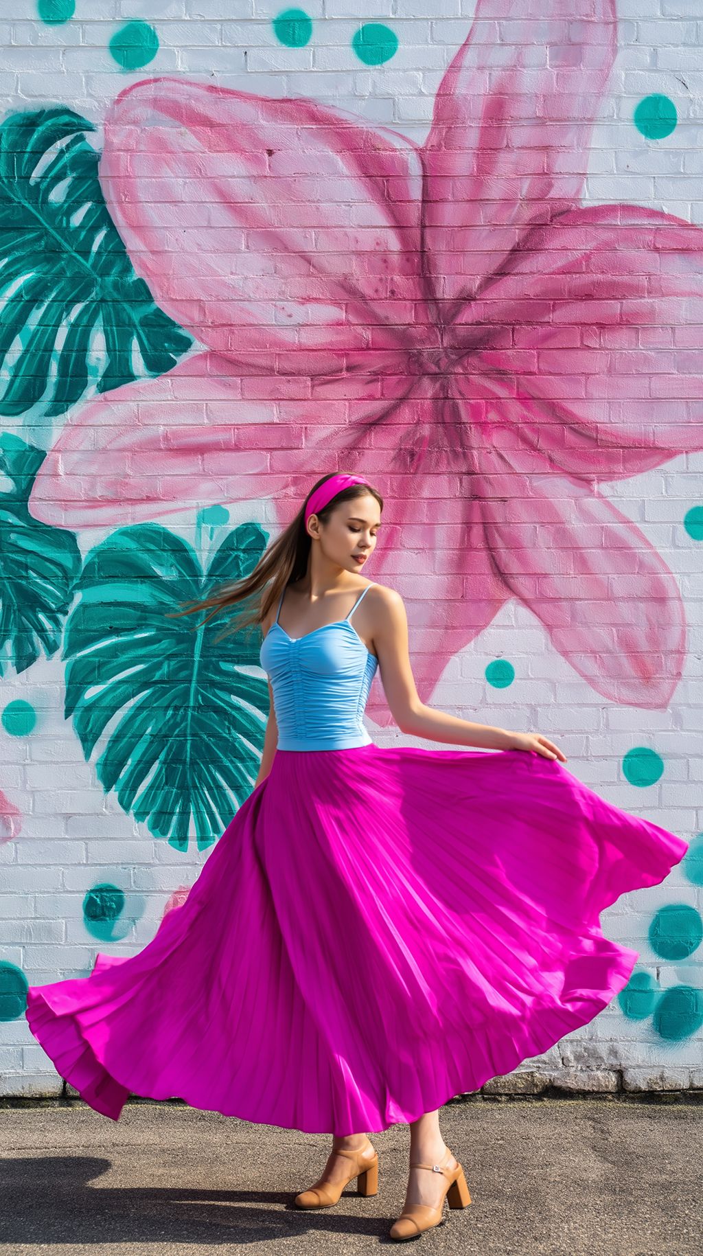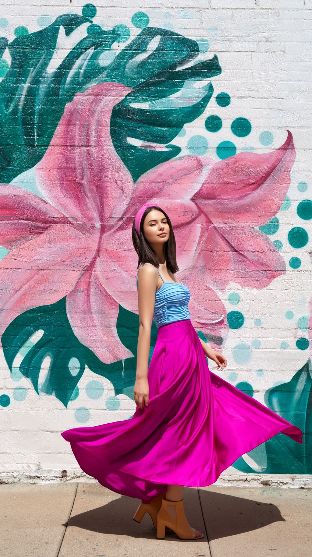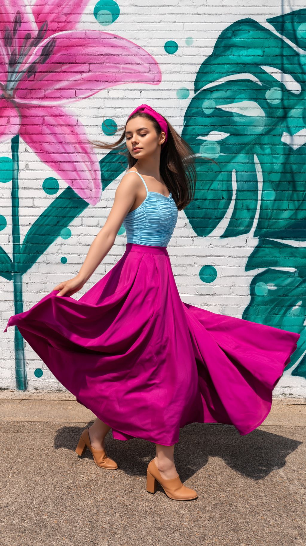 Full body portrait of a Russian woman wearing a light blue ruched camisole and flowing magenta maxi skirt, tan block heels, pink headband, spinning with the skirt spread outward, white brick mural background with giant pink lilies, emerald monstera leaves and teal dots, harsh midday sunlight, deep shadows, vibrant colors, ultra sharp details, photorealistic fashion photography
